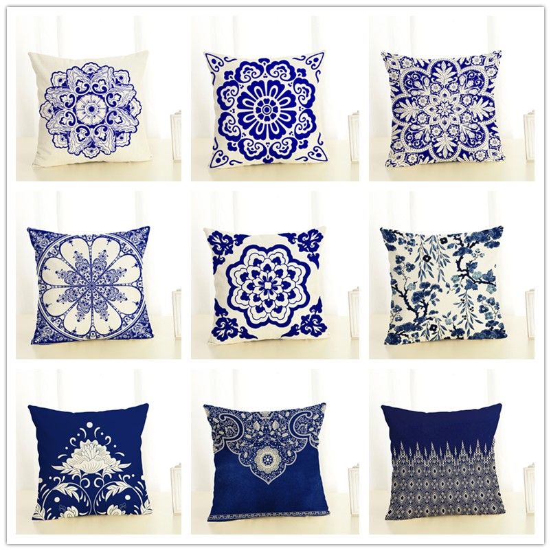 Blue And White Porcelain Print Cushion Cover Linen Throw Pillow