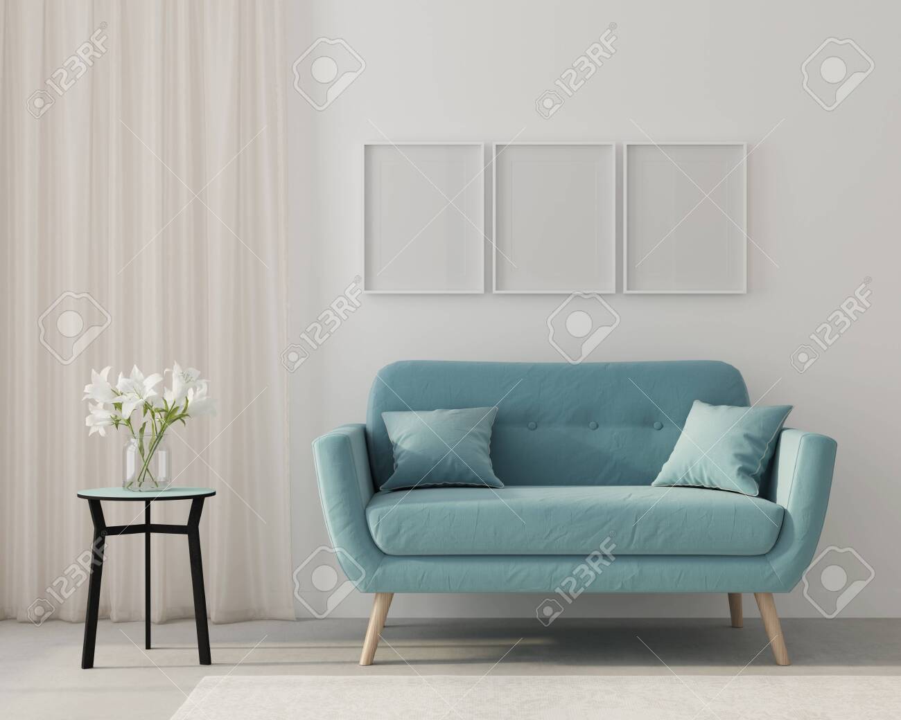 Mock Up Modern Interior Of A Living Room With A Blue Sofa A