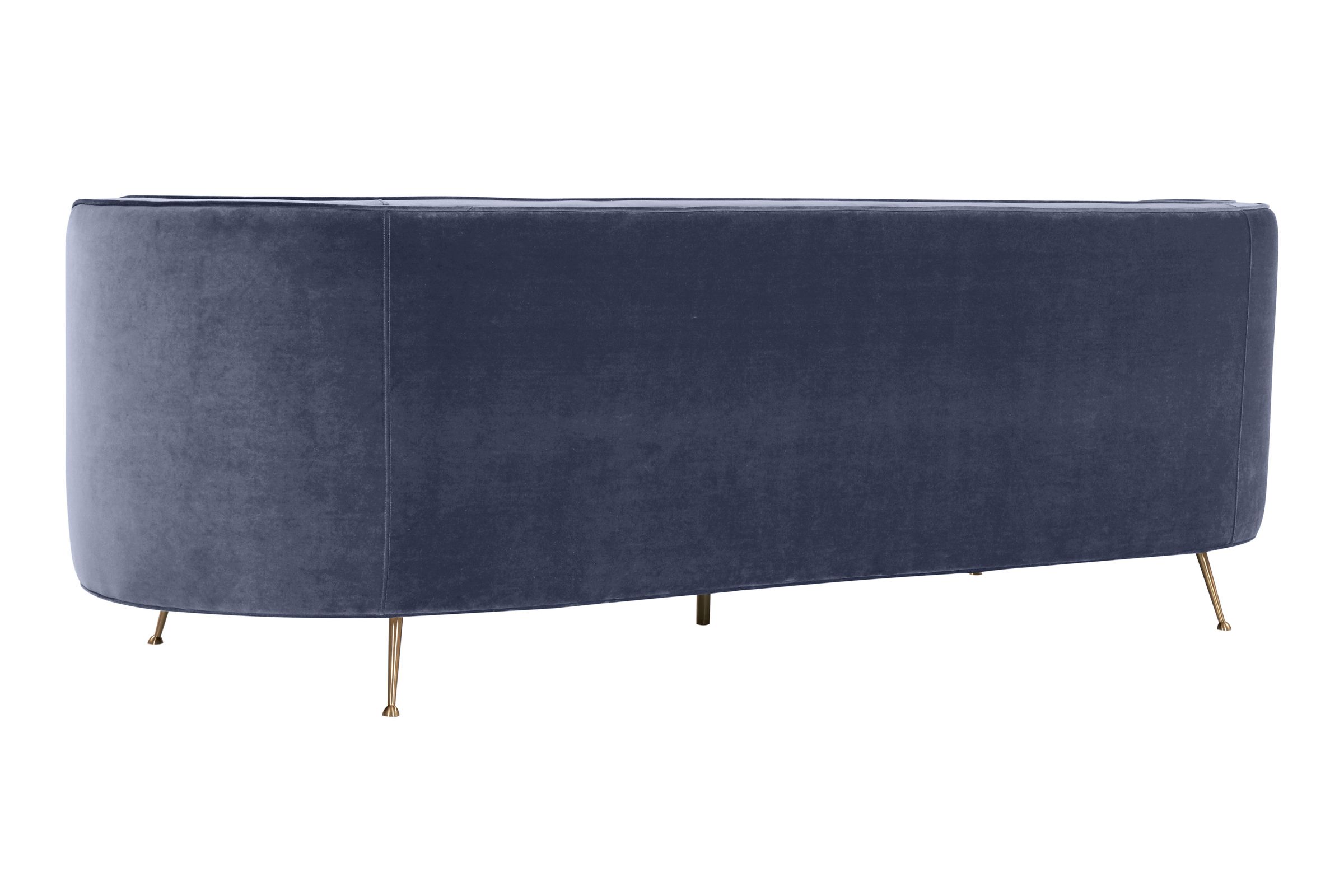 2 Moulding Dark Grey Velvet Sofa With Grey And Blue Toss Cushions