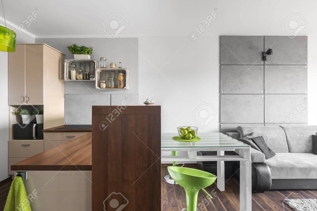 Modern Studio Flat With Small Kitchen Sofa And Round Coffee