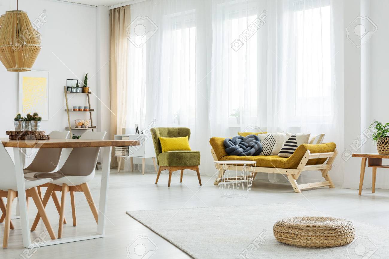 Green Vintage Chair With Yellow Pillow Next To Mustard Sofa
